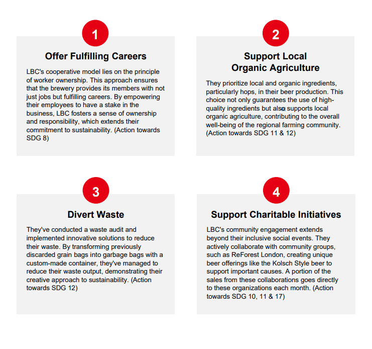 In the urban setting of London Ontario, London Brewing Cooperative operates with a cooperative model to create a more equitable and democratic approach to business ownership and operation. Rooted in values of local, organic and collaboration, LBC unites its worker-owners in a quest for sustainable excellence. From its inception, LBC has championed ethical brewing practices, supported local organic agriculture, and created a vibrant hub that nurtures social engagement. With each pour, London Brewing Co-op exemplifies how a cooperative spirit can elevate not only the brewery experience but also the community it serves.