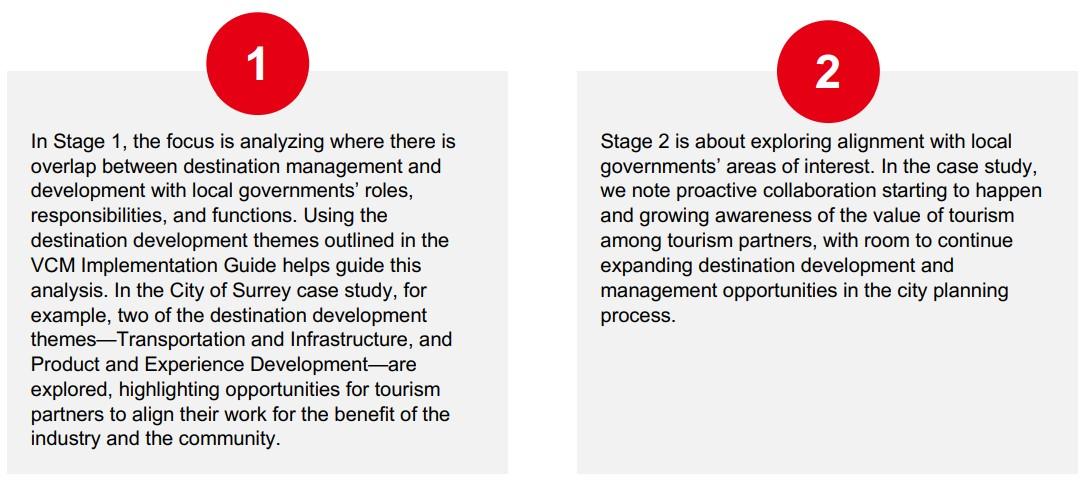 The three presented case studies showcase the VCM Implementation Guide at work, which can serve other destinations. The City of Surrey case study, specifically, highlights the early stages of destination management and development, where many other destinations across the country likely find themselves.