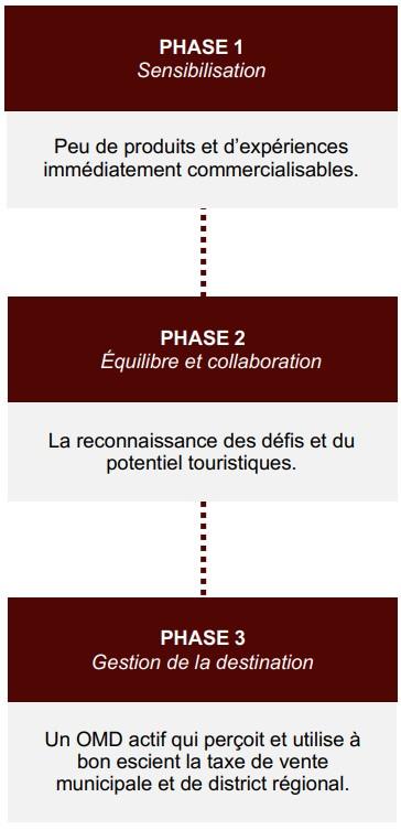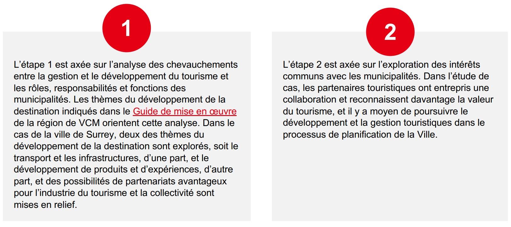 Les trois études de cas illustrent concrètement l’application du Guide de mise en œuvre de la région de VCM, qui peut être adapté à d’autres destinations. Le cas de la ville de Surrey en particulier montre les premières étapes de la gestion et du développement d’une destination, qui correspondent vraisemblablement à la situation actuelle de nombreuses destinations canadiennes.