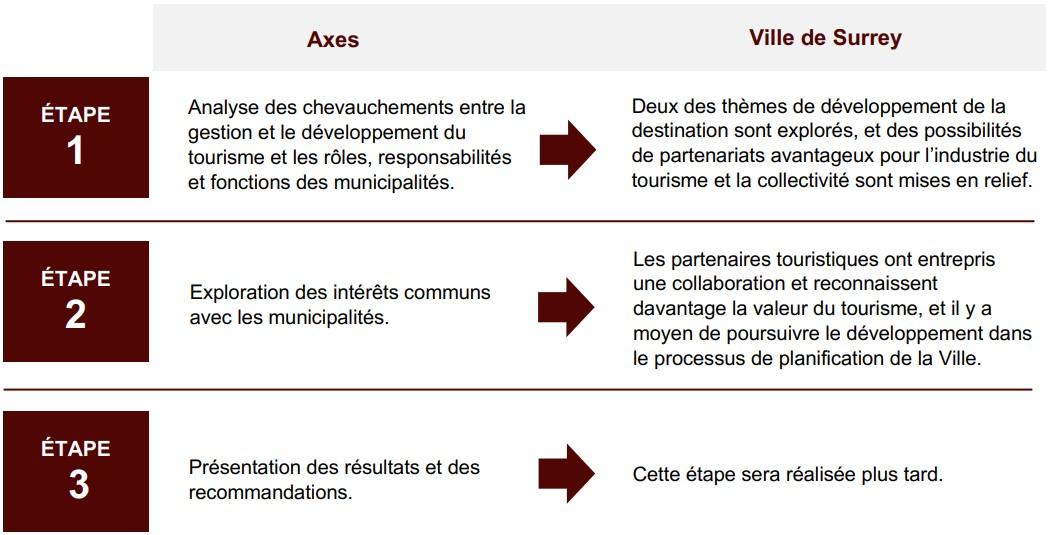 Le plan d’action dans l’étude de cas sur la ville de Surrey donne un aperçu des étapes suivantes pour la destination, notamment :