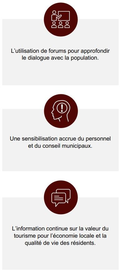 Comme l’indique le Guide de mise en œuvre de la région de VCM, les décisions des élus municipaux influent sur le tourisme – leur collaboration avec les organismes communautaires, sur la base et dans le respect des intérêts de la ville, est essentielle au succès de la destination touristique.