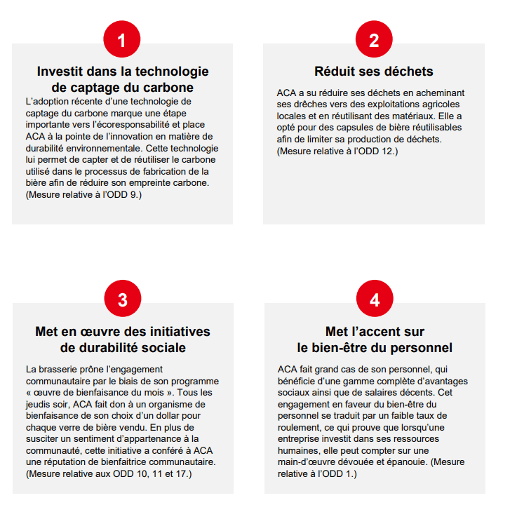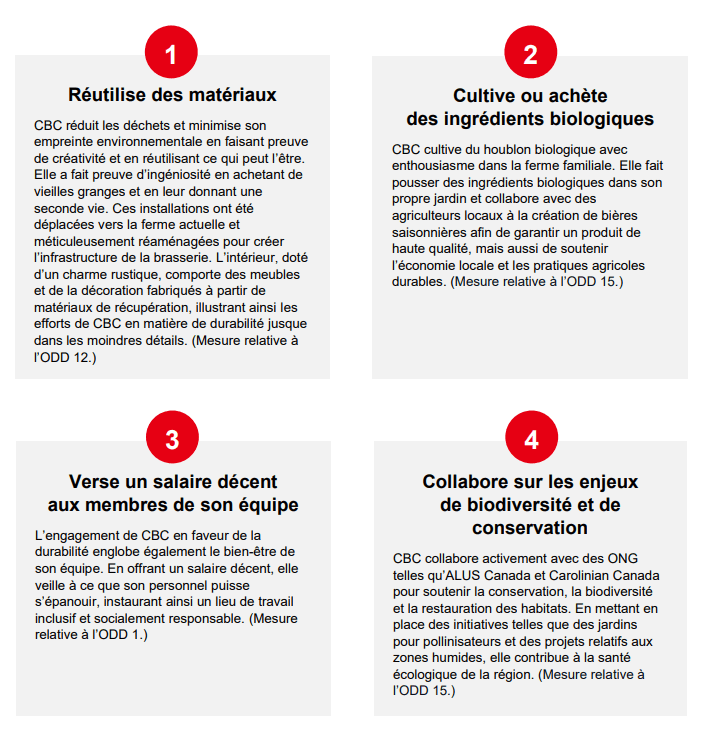 Les trois brasseries ont fait des progrès considérables dans leur démarche de durabilité, en partie grâce à l’aide découlant de diverses initiatives gouvernementales. Si les ressources ainsi octroyées ont permis d’investir dans des technologies innovantes telles que le captage du carbone, des systèmes de réacheminement des déchets et des équipements écoénergétiques, il importe de souligner que la voie de la durabilité ne passe pas uniquement par des financements. Elle repose plutôt sur un engagement profond et une volonté sans faille de générer des retombées positives pour les communautés locales et l’environnement. Les trois brasseries sont par ailleurs tout à fait conscientes qu’elles tiennent là une occasion de sensibiliser leurs clients aux enjeux de la durabilité. S’il est indéniable que de nombreux clients fréquentent ces établissements pour y déguster de la bonne bière, les brasseries peuvent néanmoins sensibiliser leurs clients aux différents piliers de la durabilité. Elles tirent d’ailleurs généralement parti de leurs blogues, de l’affichage sur place et des visites des lieux pour présenter leurs initiatives.
